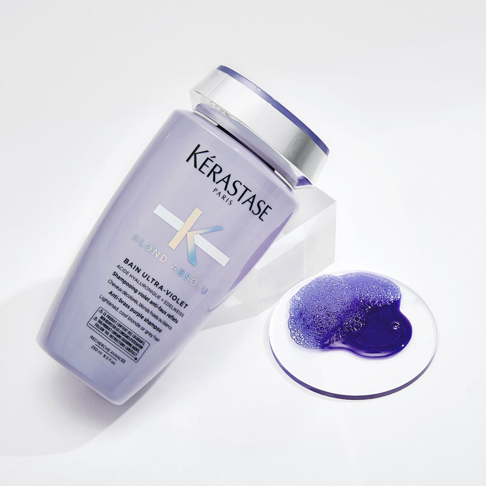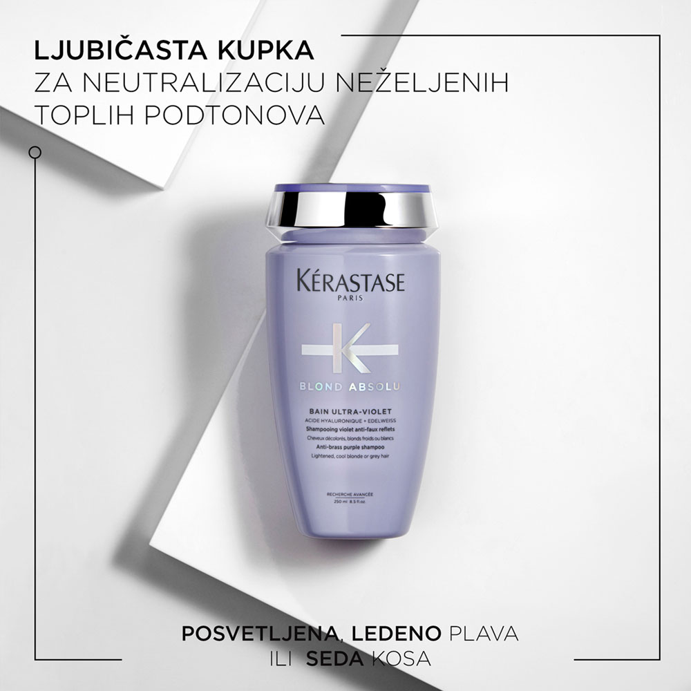 Ljubičasta kupka, obogaćena neutrališućim agensima trenutno neutrališe tople neželjene podtonove. Idealna za ledeno-plave i sive nijanse kose. Redovna upotreba ove kupke doprinosi neutralizaciji bakarnih podtonova, štiti kosu od zagađenja, čini je mekšom i sjajnijom. Obogaćena moćnom kombinacijom hijaluronske kiseline i ekstrakta cveta runolista, formula trenutno povećava blistavost blond kose i intenzivno neguje vlasi.