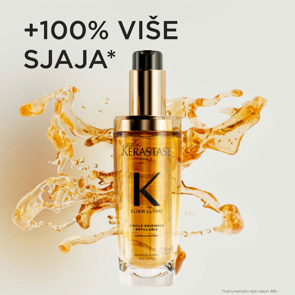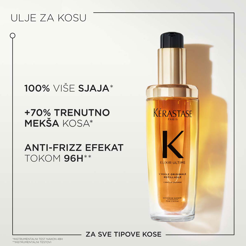 Elixir Ultime ulje za sve tipove kose. Ujedinjena u formuli sa divljom kamelijom, francuska kamelija se delikatno ručno bere u francuskoj regiji Brittany i pažljivo bira zbog svojih negujućih i omekšavajućih svojstava, kao i moći vraćanja sjaja.