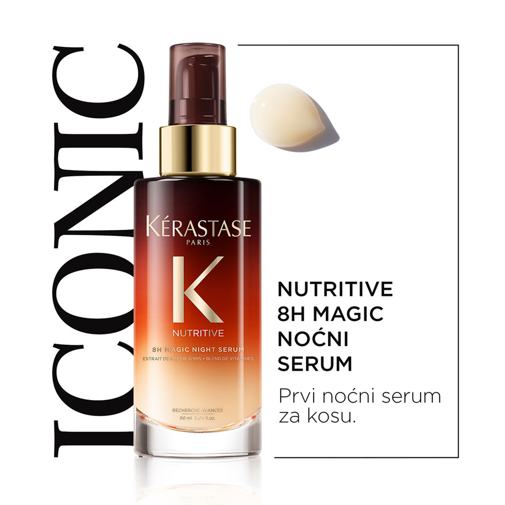 Intenzivno negujući Nutritive noćni serum za kosu, koji se ne ispira neguje i ojačava sve tipove suve kose. Ovaj noćni tretman za kosu sadrži polimere protiv isušivanja za trenutnu negu sa laganim i nemasnim završnim efektom. Esencijalni hranjivi sastojci (proteini prirodnog porekla + niacinamid) hrane kosu progresivno i trajno tokom 8 sati (poništavaju dnevni gubitak hranljivih materija i stvaraju glatki premaz na vlasima) i štite od trenja jastuka. Kremasta tekstura koja ne otežava se brzo upija.