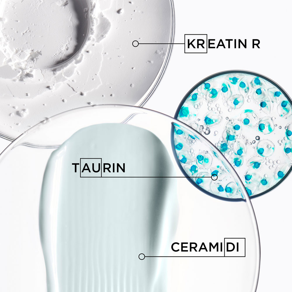 Kupka za jačanje dužina za kosu kojoj je potreban zdrav izgled dužina. Oslabljena kosa sklona lomljenju je ojačana, a njena struktura je obnovljena. Ova pročišćavajuća kupka obogaćena kreatinom R, aktivnim kompleksom osmišljenim za povećanje otpornosti i elastičnosti i Taurinom, aminokiselinom poznatom po svom zaštitnom delovanju, štiti vlasi i poboljšava područje korena. Kosa je temeljno očišćena, a dužine su ojačane.