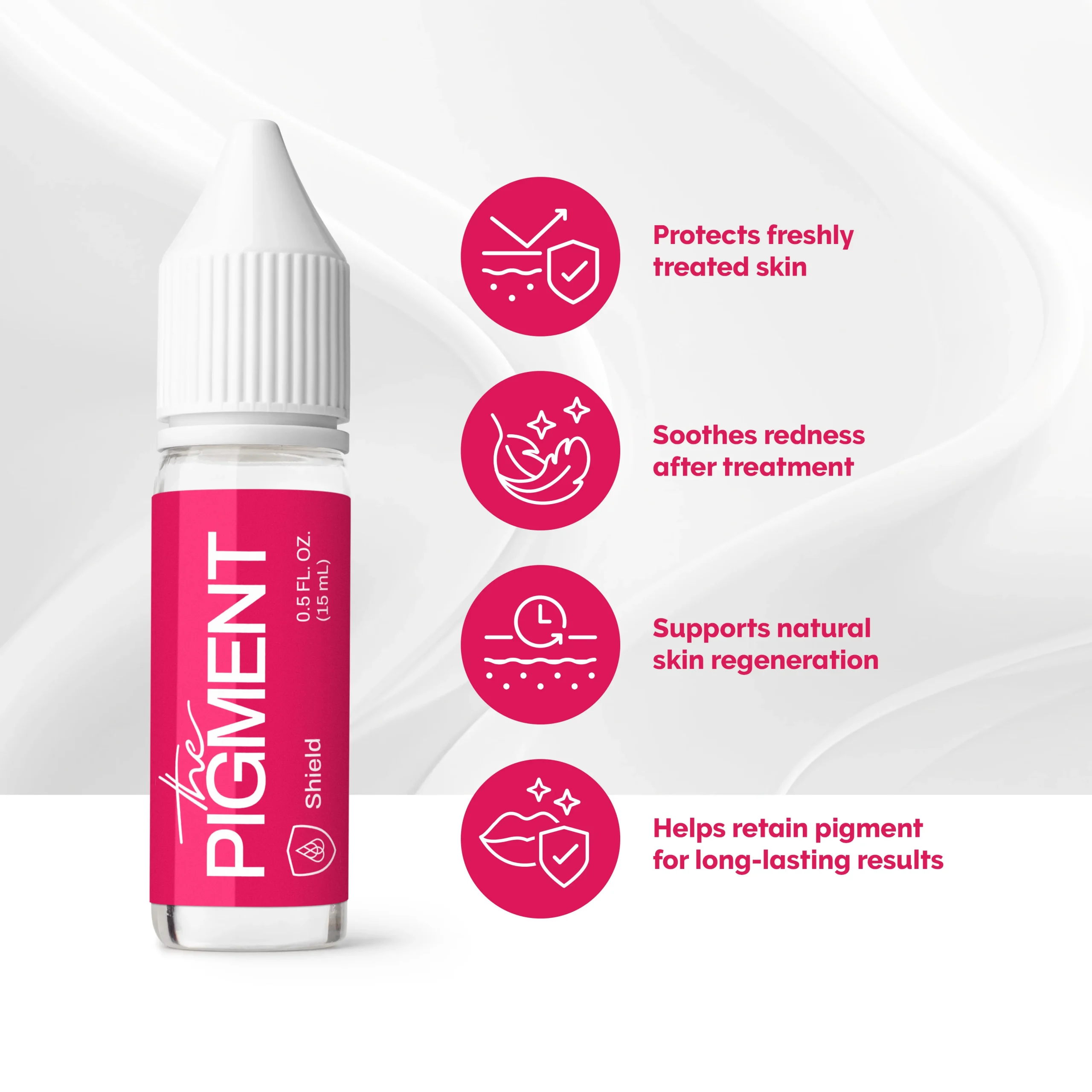 SHIELD je posebno razvijen za negu nakon PMU i microblading tretmana. Bogata, providna tekstura formira zaštitni film preko tretiranog područja i štiti pigment nakon tretmana. Takođe umiruje crvenilo i podržava prirodnu regeneraciju kože.